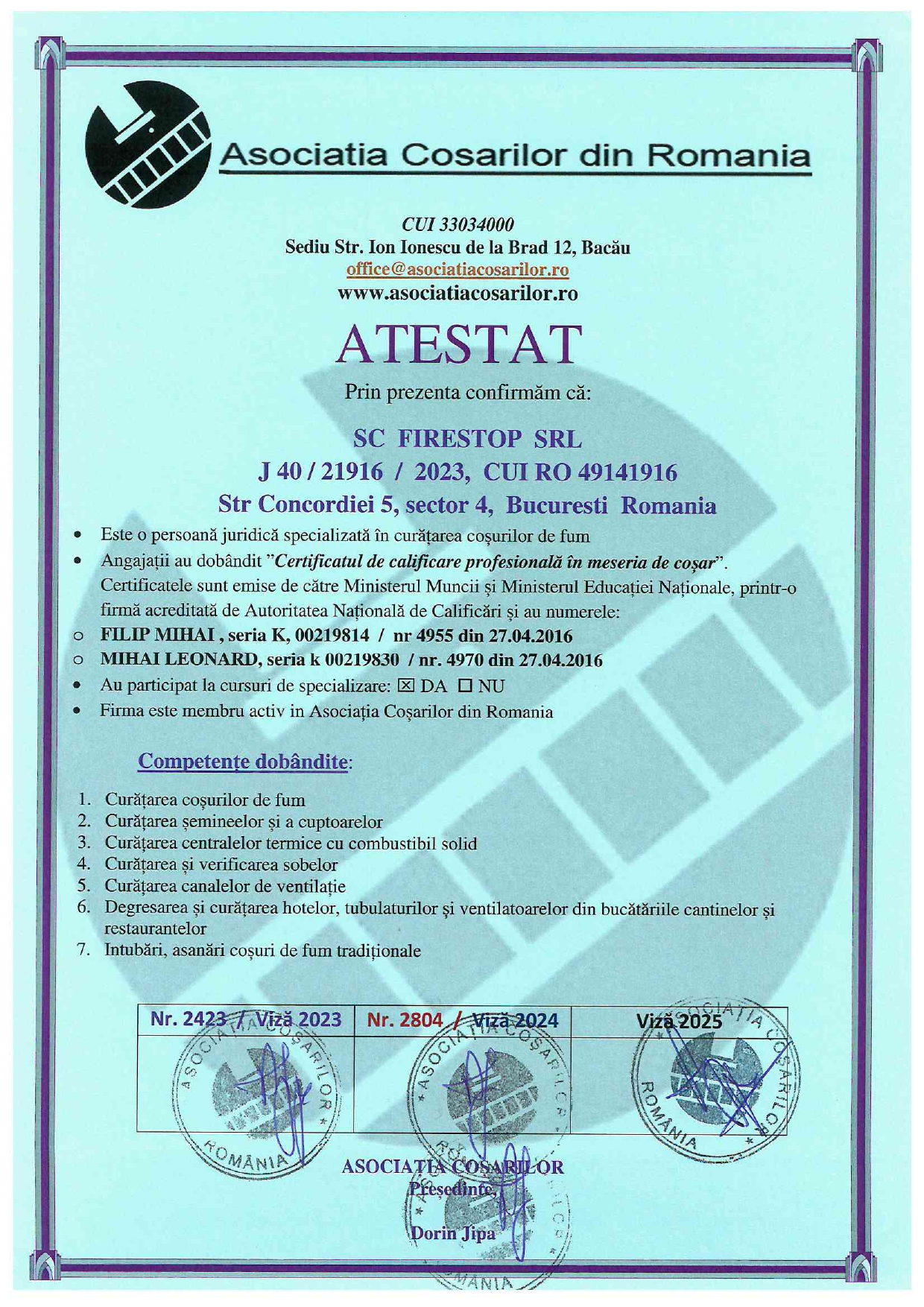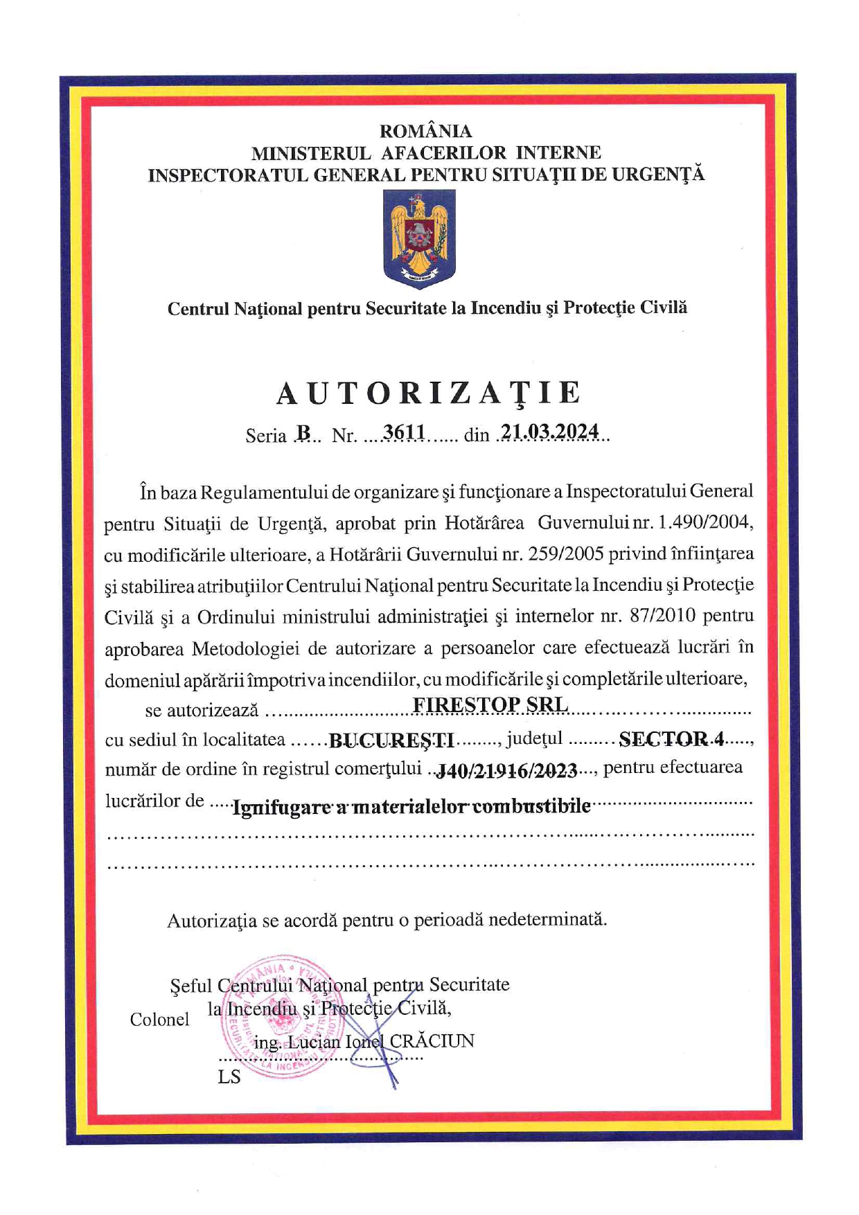 Fire Stop oferă servicii de ignifugare și de prevenție a incediilor care sunt autorizate de autoritățile competente. Profesionalismul companiei este dovedit de experiența de peste 20 de ani în domeniul PSI și de colaborarea cu compania S.C. FIRESTOP S.R.L., fiind o marcă înregistrată a acesteia. Clienții vor găsi standarde internaționale de calitate respectate întotdeauna cu seriozitate.